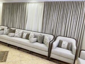 اطلب الآن كنب فاخر عالي الجودة مع ستائر مميزة. خدمة تركيب احترافية مجانية وضمان 5 سنوات. تصميم أنيق يضفي فخامة على منزلك مع راحة استثنائية لجميع أفراد الأسرة.